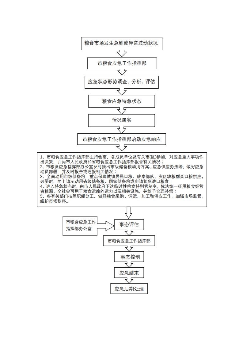 (二)各有关部门按照职能分工,及时采取应急措施,做好粮食采购、调运、加工和供应工作,加强市场监管,维护市场秩序。